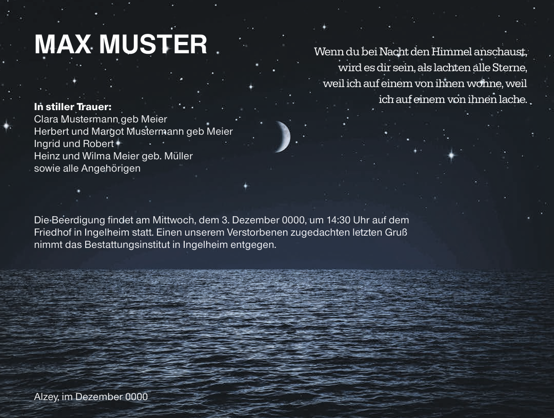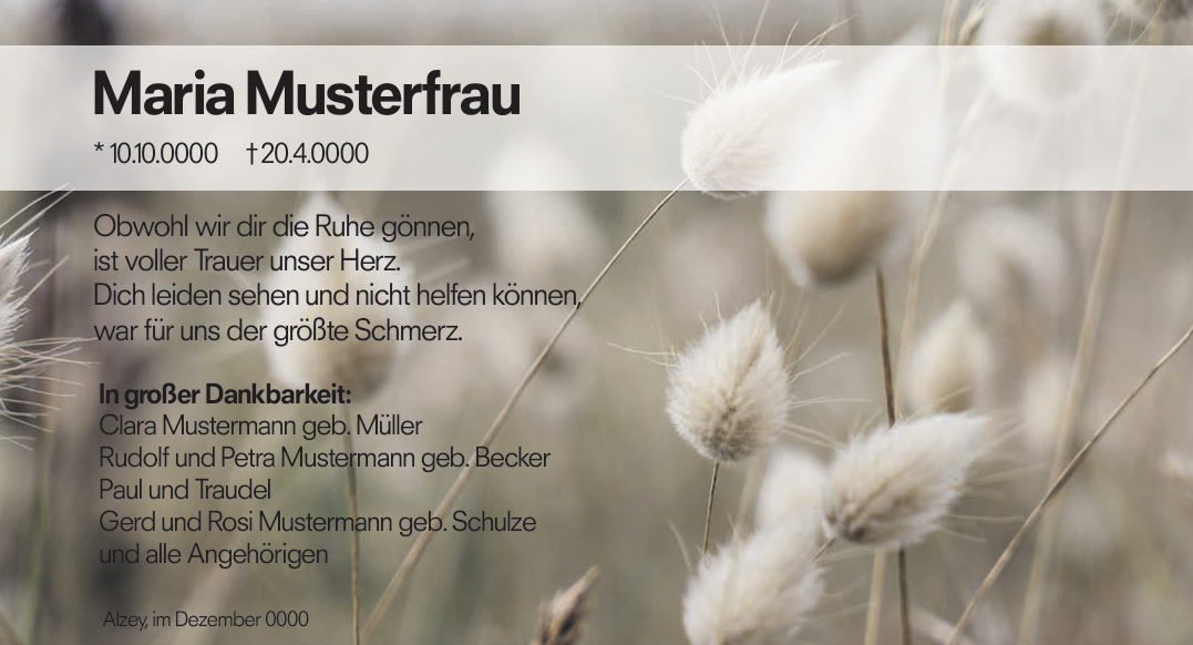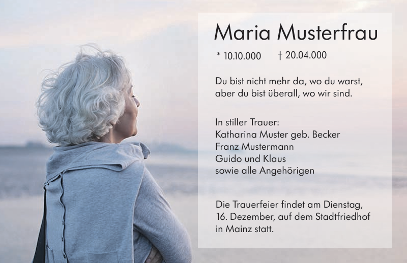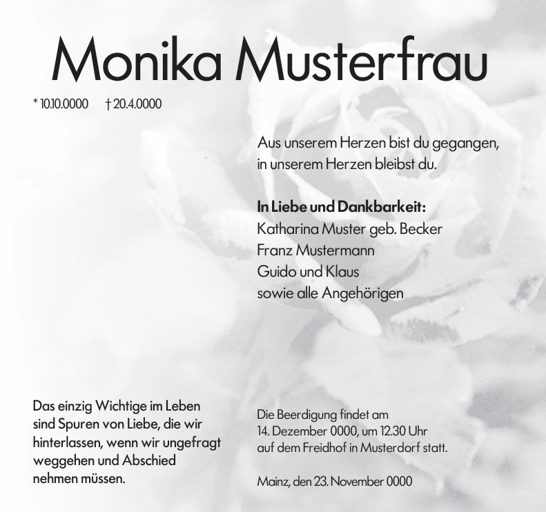Als zeitgemäße Alternative erstellen wir digitale Traueranzeigen, die sich einfach per E-Mail oder über soziale Medien wie WhatsApp und Instagram versenden und teilen lassen. So erreichen Sie auch Menschen, die nicht vor Ort leben oder keinen Zugang zu klassischen Medien haben.