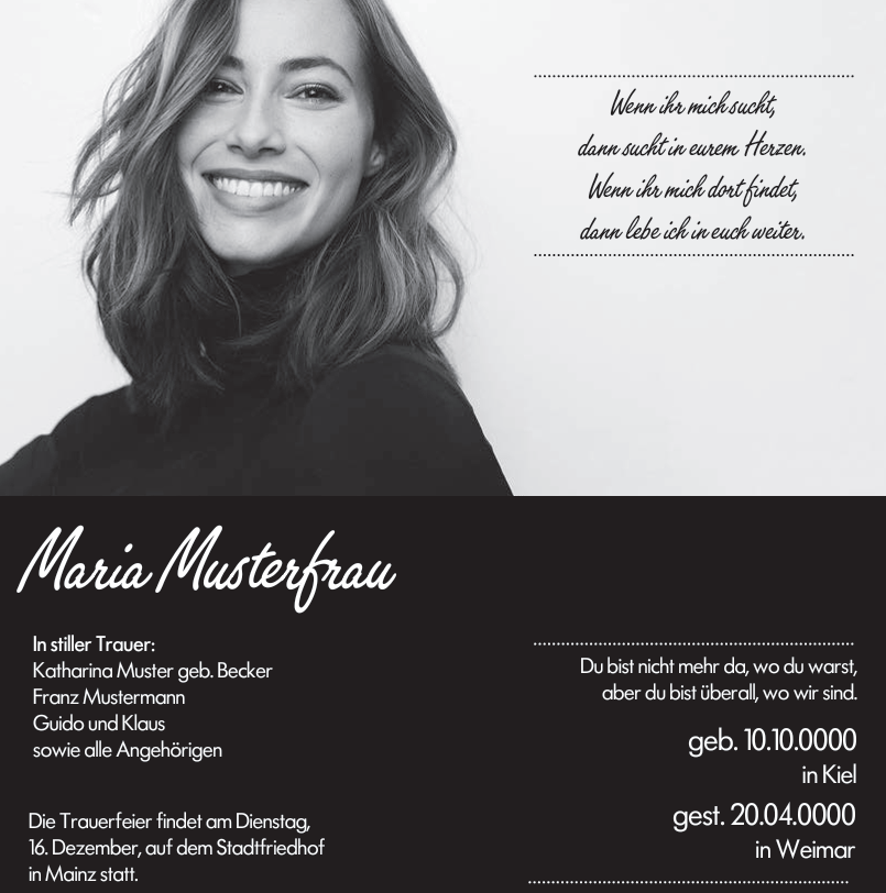 Als zeitgemäße Alternative erstellen wir digitale Traueranzeigen, die sich einfach per E-Mail oder über soziale Medien wie WhatsApp und Instagram versenden und teilen lassen. So erreichen Sie auch Menschen, die nicht vor Ort leben oder keinen Zugang zu klassischen Medien haben.